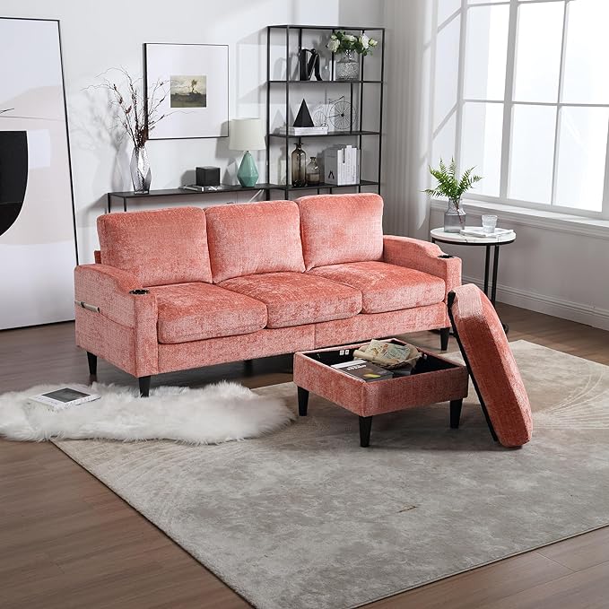 Convertible Sectional Sofa with Movable Storage Ottoman and Cupholders, 3 Seater L-Shaped Corner Couch,Chenille Upholstered Furniture w/Detachable Thicked Cushions for Living Room, Small Space