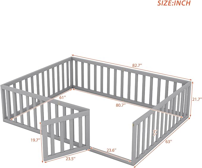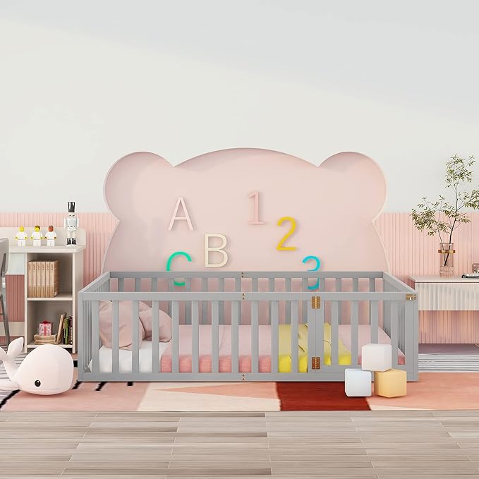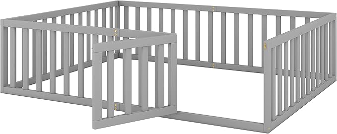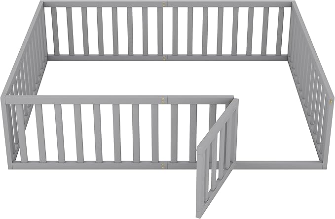 Multifunctional Queen Size Floor Bed with Safety Guardrails and Door, Montessori Sturdy Solid Wood Beds Frame, Easy Assembly and No Spring Need, for Boys and Girls Room, Gray