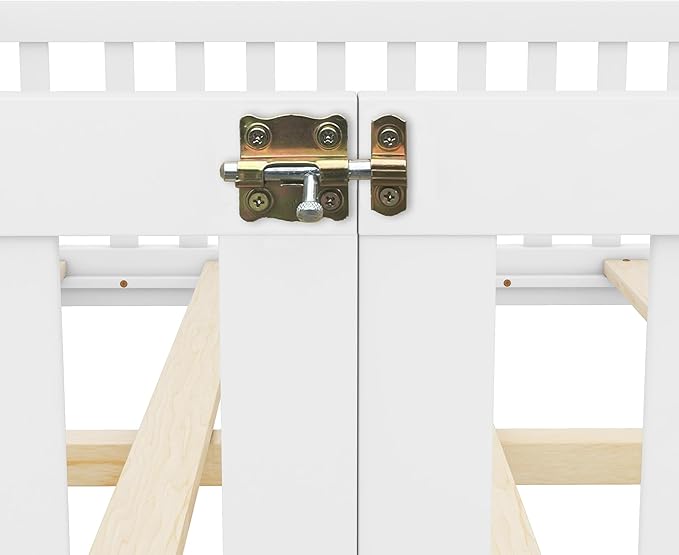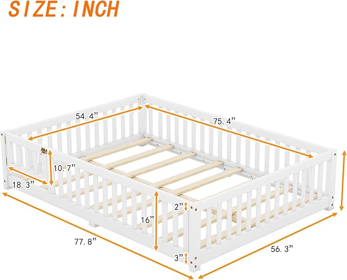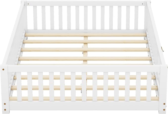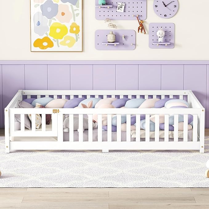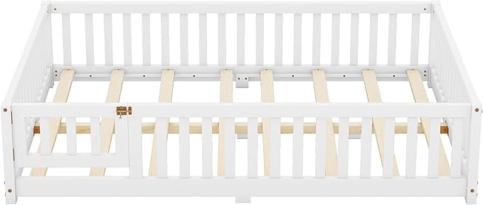 Multifunctional Full Size Floor Bed with Safety Guardrails and Door, Removable Wood Slats, Montessori Beds Frame for Toddlers, Easy Assembly, for Boys and Girls Room, White