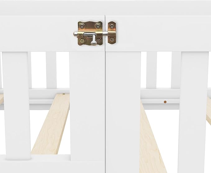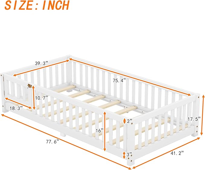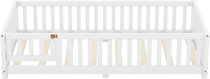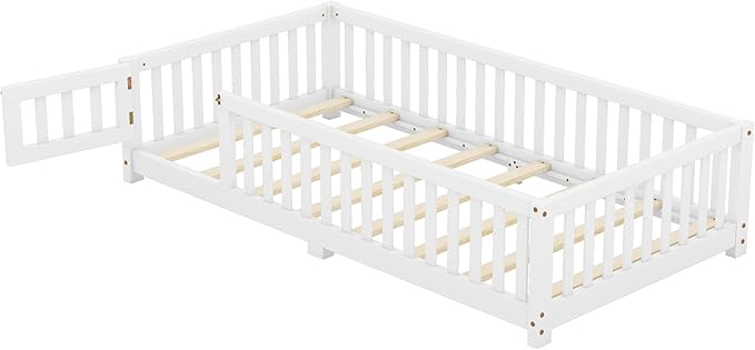 Multifunctional Twin Size Floor Bed with Safety Guardrails and Door, Removable Wood Slats, Montessori Beds Frame for Toddlers, Easy Assembly, for Boys and Girls Room, White