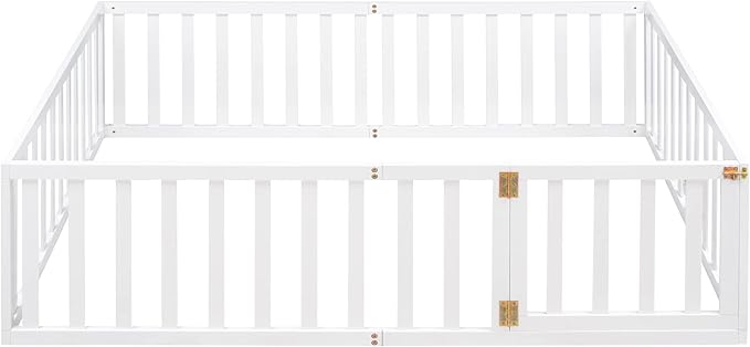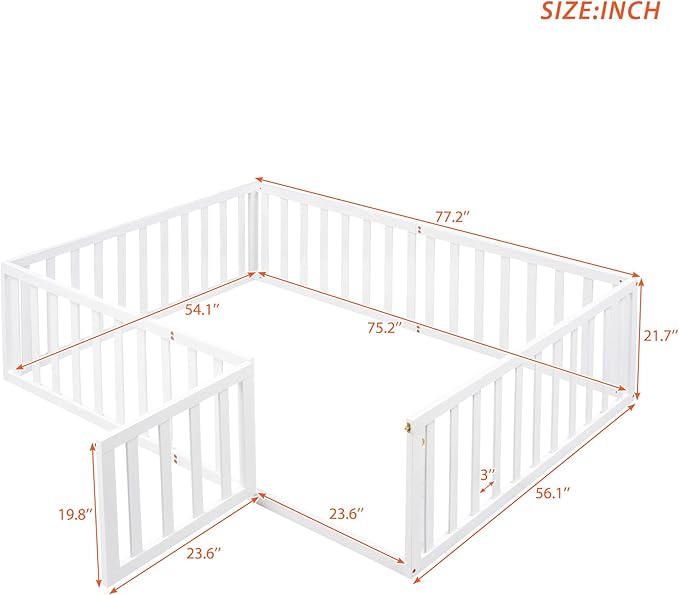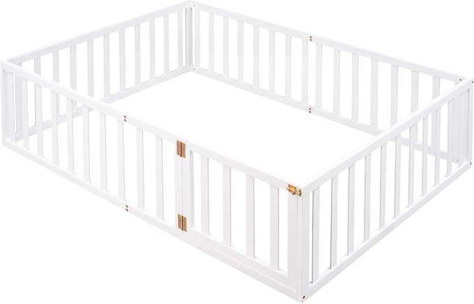 Multifunctional Full Size Floor Bed with Safety Guardrails and Door, Montessori Sturdy Solid Wood Beds Frame, Easy Assembly and No Spring Need, for Boys and Girls Room, White