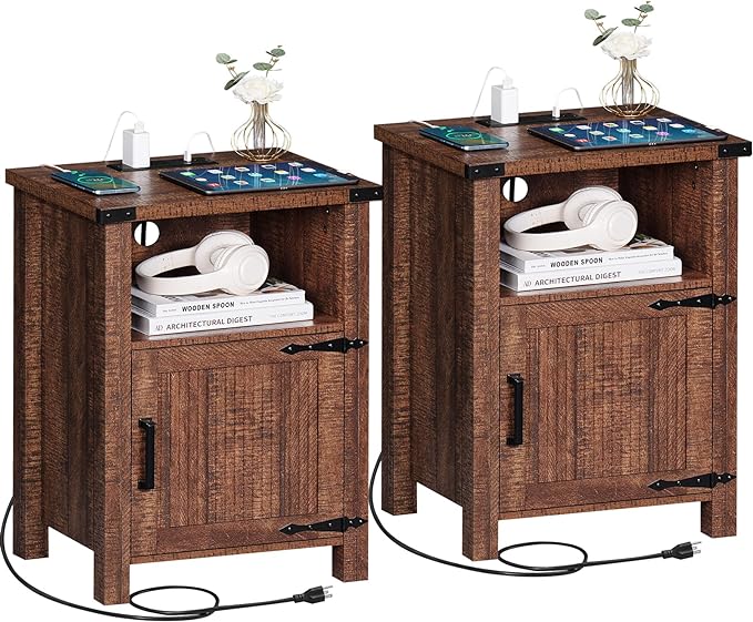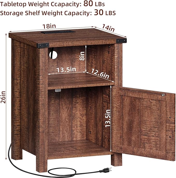 Night Stand Set of 2, 18 Inch Farmhouse Nightstand with with Charging Station and USB Port, Rustic Wood Bedside Table with Magnetic Door, Bed Side Tables for Bedroom, Reclaimed Barnwood
