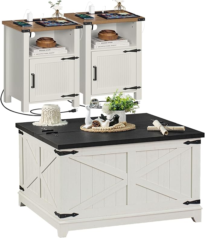 Antique White Nightstand Set of 2, 18 Inch Farmhouse Night Stand with Charger Station and USB Port, Modern Couch Side Table with Magnetic Door and Storage Shelf, Bedside Tables for Bedroom