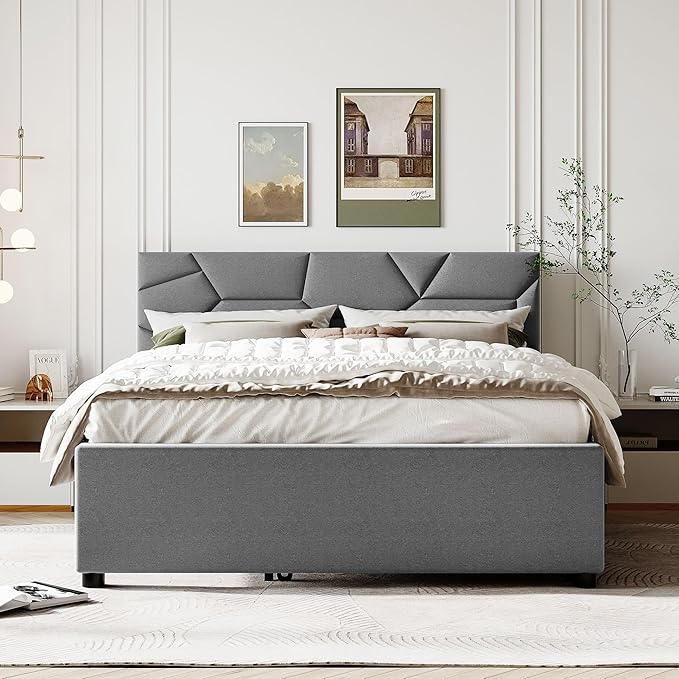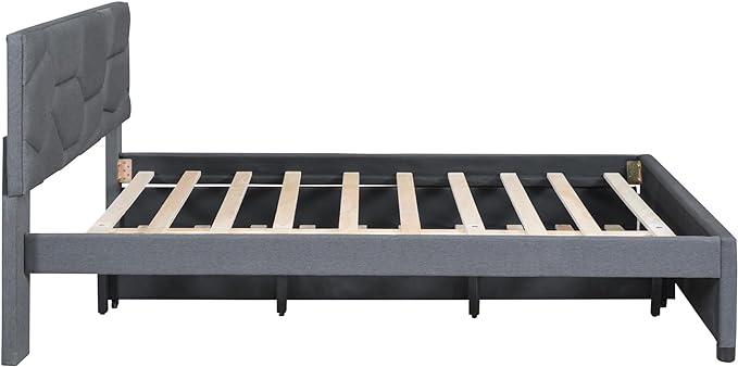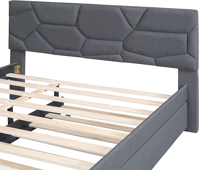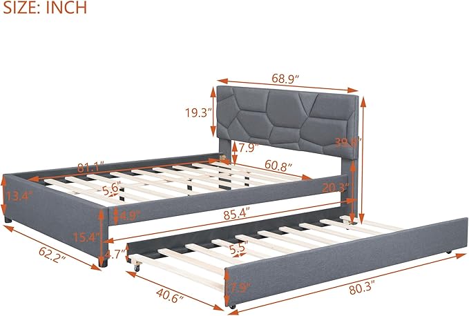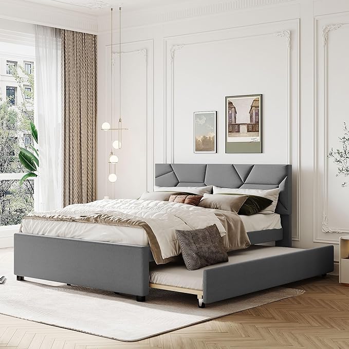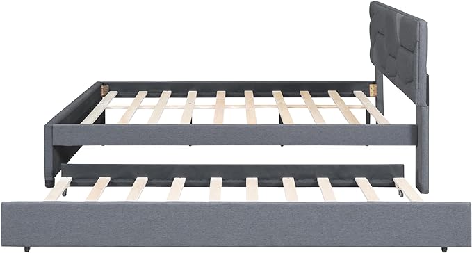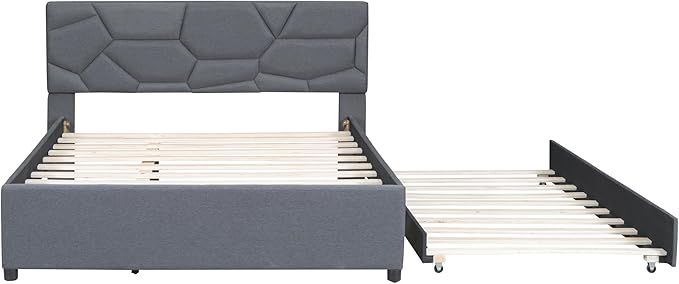 Queen Size Upholstered Platform Bed with Brick Pattern Headboard and Twin XL Size Trundle,Bedroom Bed Frame w/Linen Fabric,Wooden Slats Supproted,for Teens Kids Adults,Gray