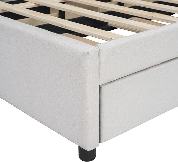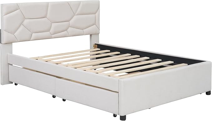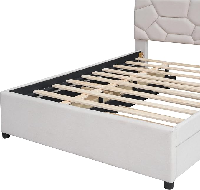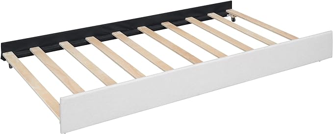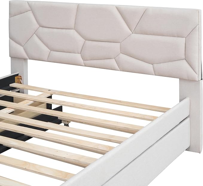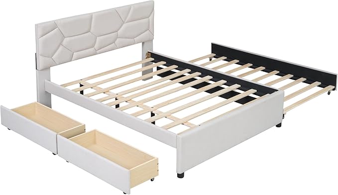 Full Size Linen Upholstered Platform Bed with Twin Size Trundle and 2 Drawers,Bedroom Bed Frame w/Brick Pattern Headboard,Wooden Slats Supproted,for Teens Kids Adults,Beige