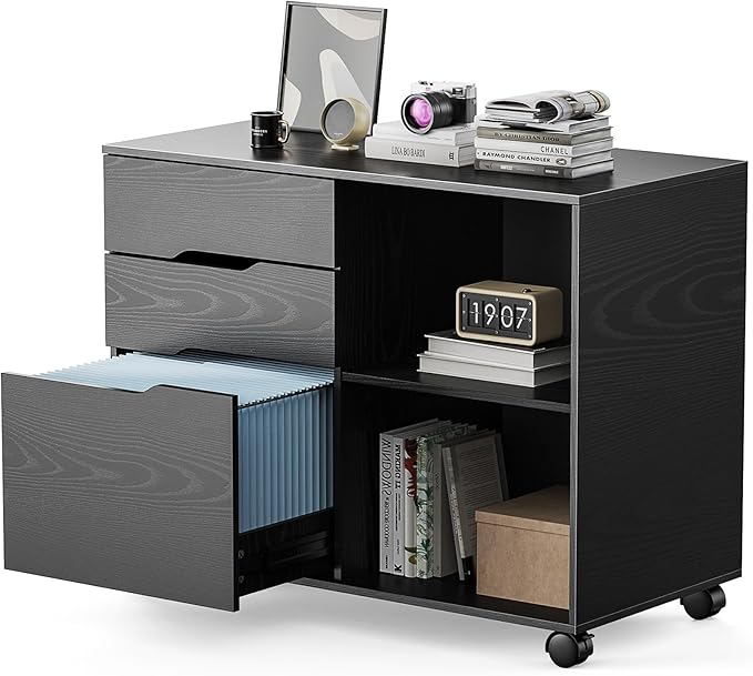 Sweetcrispy 3 Drawer File Cabinet Organizer Lateral Printer Stand Rolling Desk with Adjustable Storage Shelves for Office Home Small Space, Black Wood