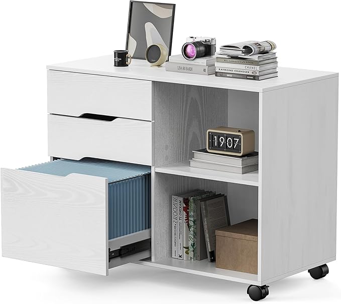 Sweetcrispy 3 Drawer File Cabinet Organizer Lateral Printer Stand Rolling Desk with Adjustable Storage Shelves for Office Home Small Space, White Wood