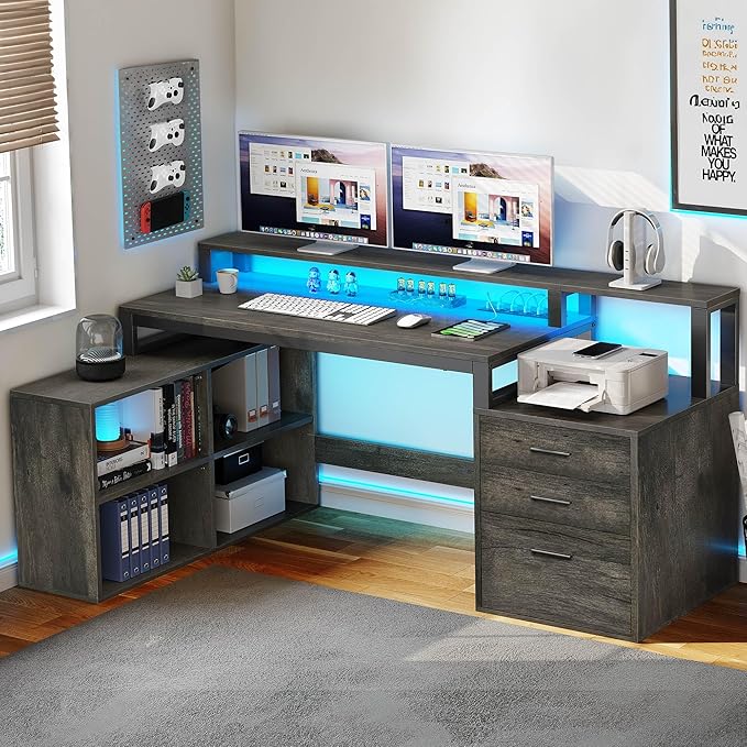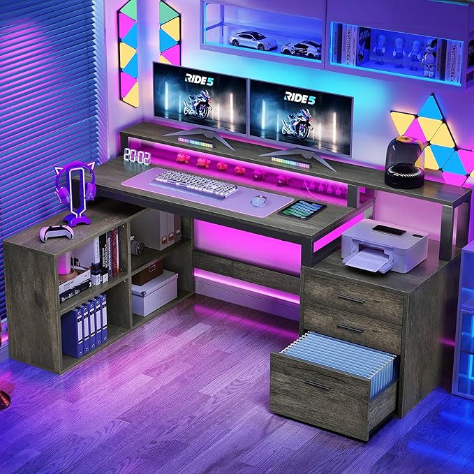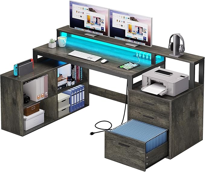 DWVO L Shaped Desk with Power Outlets & LED Lights, 65" Computer Desk with Drawers, Corner Desk Office Desk with File Cabinet & Printer Stand, Grey