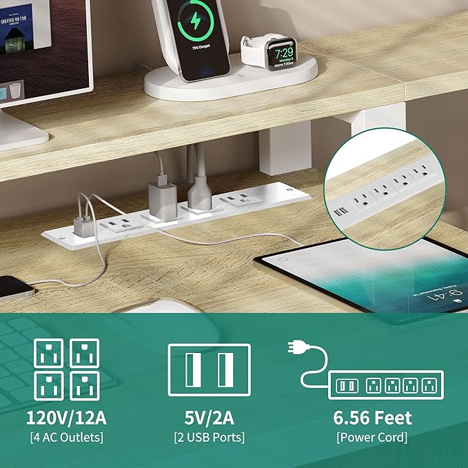 About This Convenient Charging Station: This computer desk with drawers features 2 USB ports, 4 power outlets & a 6.56ft...