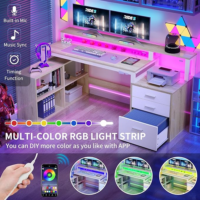 DWVO L Shaped Desk with Power Outlets & LED Lights, 65" Computer Desk with Drawers, Corner Desk Office Desk with File Cabinet & Printer Stand, White & Oak