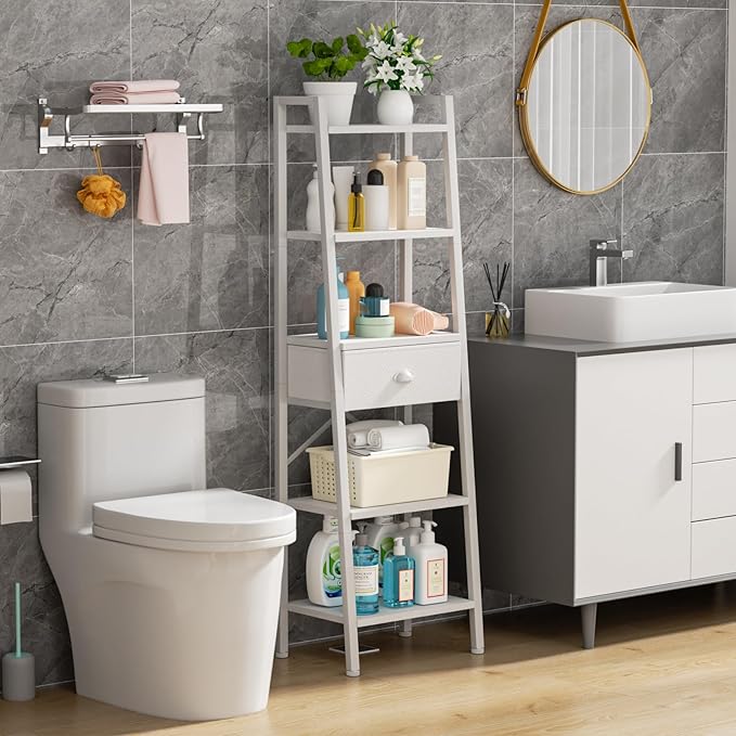 Furologee 5 Tier BookShelf, Ladder Shelf with Drawer, Tall Bookcase Corner Shelf, Narrow Shelf Industrial Display Standing Units for Home Office, Living Room, Bedroom, Kitchen, White