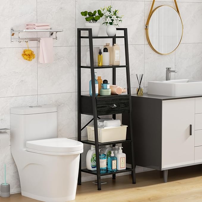 Furologee 5 Tier BookShelf, Ladder Shelf with Drawer, Tall Bookcase Corner Shelf, Narrow Shelf Industrial Display Standing Units for Home Office, Living Room, Bedroom, Kitchen, Black Oak
