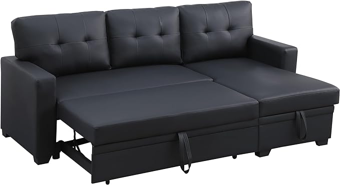 RITSU L-Shaped Sectional Upholstered Sofa Bed with Storage Chaise, Faux Leather Pull Out Corner Couch, Tufted Cushions, for Office, Living Room, Apartment, Black, 82 inch