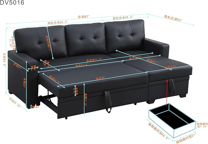 RITSU L-Shaped Sectional Upholstered Sofa Bed with Storage Chaise, Faux Leather Pull Out Corner Couch, Tufted Cushions, for Office, Living Room, Apartment, Black, 82 inch