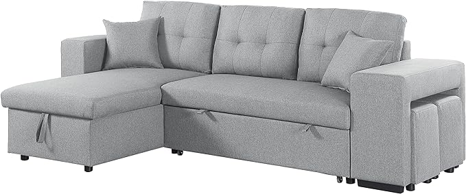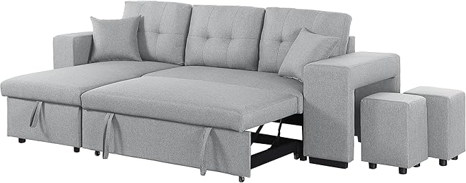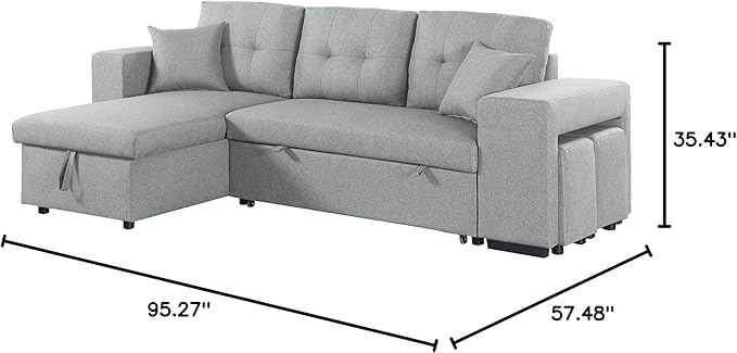 RITSU Reversible Sectional Sofa with Pull Out Loveseat Sleeper Bed Storage Space and 2 Stools, Corner Couch with Side Cabinets, Suitable for Living Room, Apartment Light Gray, 95.27inch