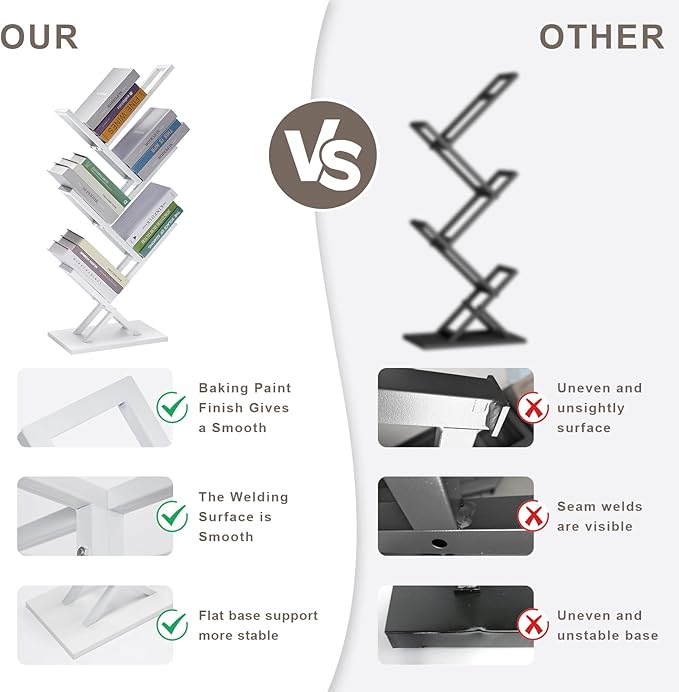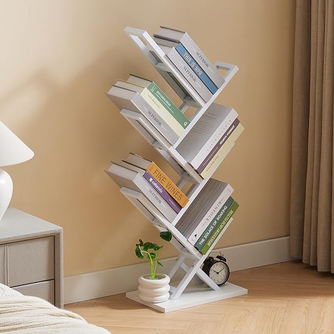 5 Tier Tree Bookshelf, Small Iron Corner Bookcase, Modern Book Shelf Storage Display Floor Standing Bookcase, Utility Organizer for CDs/Books/Home Office/Living/Bedroom Room- White