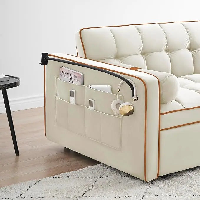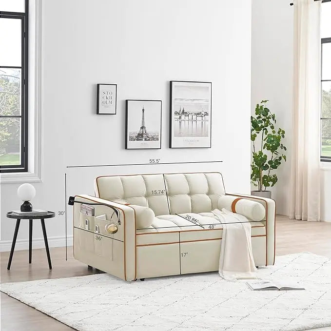 Multi-Functional Convertible Sleeper Sofa Pull Out Bed with Phone Stand and Side Pockets, 3 in 1 Futon Loveseat Couch Pullout Sofabed w/Reclining Backrest and Pillows for Living Room Office RV