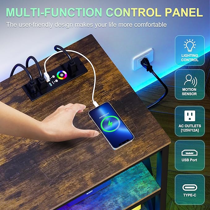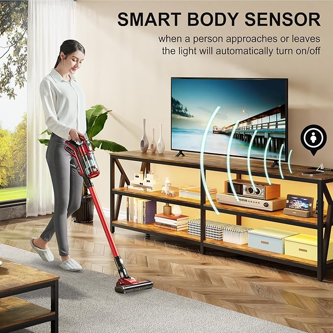 Lvifur LED TV Stand for 65 70 75 inch TV, Auto Sensor Entertainment Center with RGB Dimmable Lights, TV Console Table with Open Storage Shelves and Metal Frame (Rustic Brown)