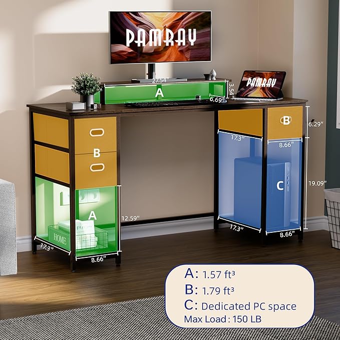 Pamray 55 Inch Computer Desk with Non-woven Storage Drawers and Monitor Stand Home Office Desk for Bedroom Study Table Writing and Work Desk Vintage