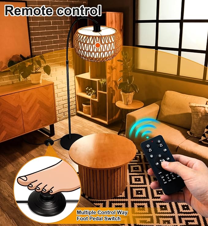 Arc Floor Lamp for Living Room, 3 Color Temperatures Farmhouse Standing Lamps with Remote & Dimmable Bulb, Rattan Boho Floor Lamp with Fabric Shades, Adjustable Tall Lamp for Bedroom Office