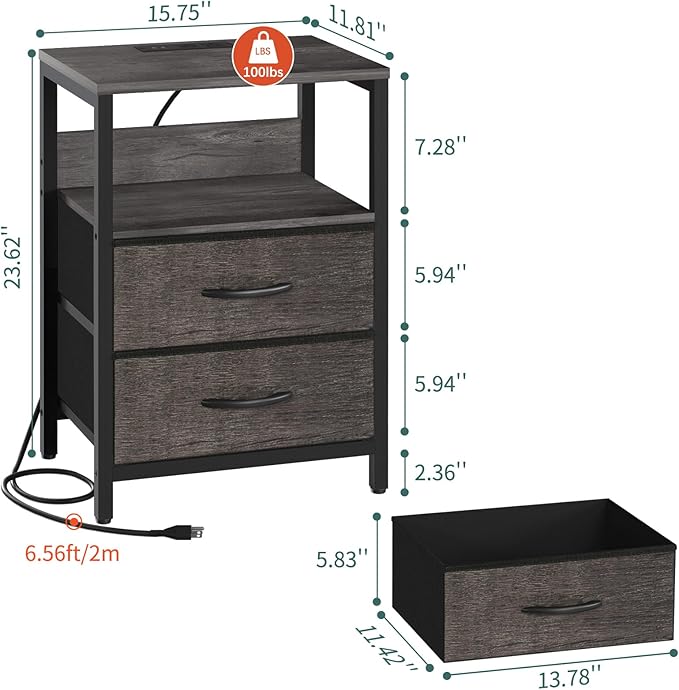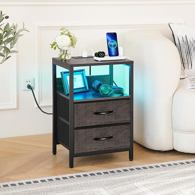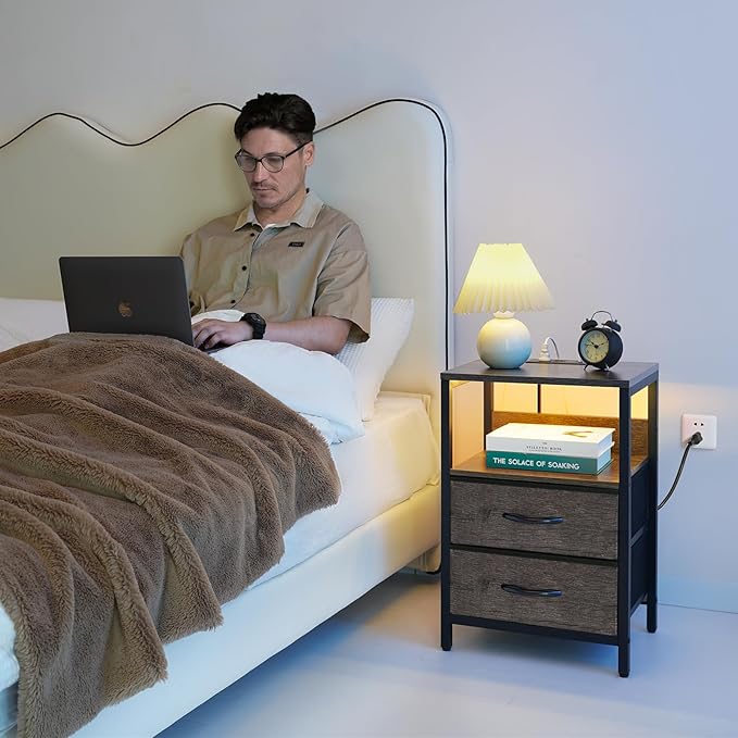 Yoobure Nightstand with Charging Station, LED Night Stand with Fabric Drawers and Storage Shelf for Bedroom, Nightstands Bedside Tables with USB Ports & Outlets, Small Night Stands, Bed Side Table