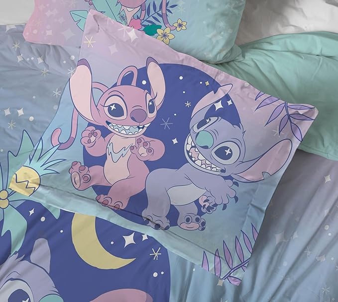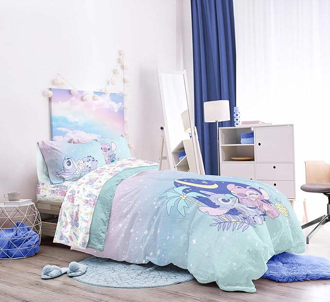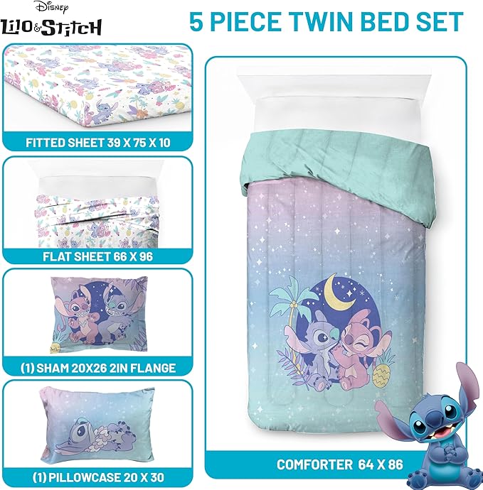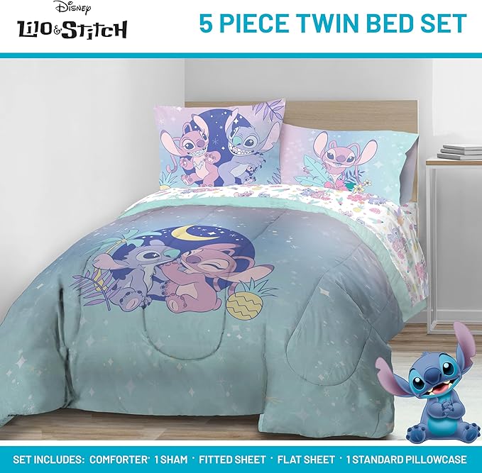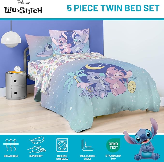 Disney Lilo and Stitch Twin Size Comforter Set - 5 Piece Floral Bedding includes Sheet Set & Pillow Covers Features Angel - Super Soft Purple & Teal Stars Kids Bedding