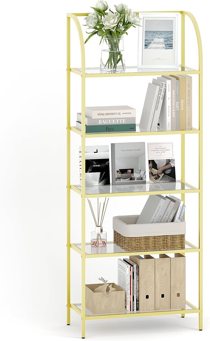 Bookcase Bookshelf, Tempered Glass Arched Bookshelf for More Storage, Slim Shelving Unit for Bedroom, Bathroom, Home Office, Steel Frame, Wide 5 Tier Gold BC22599G