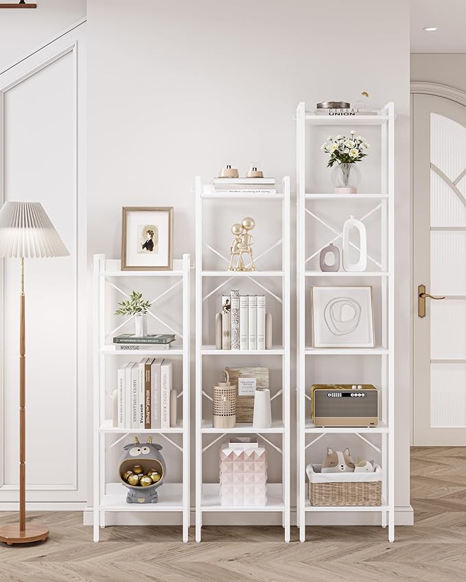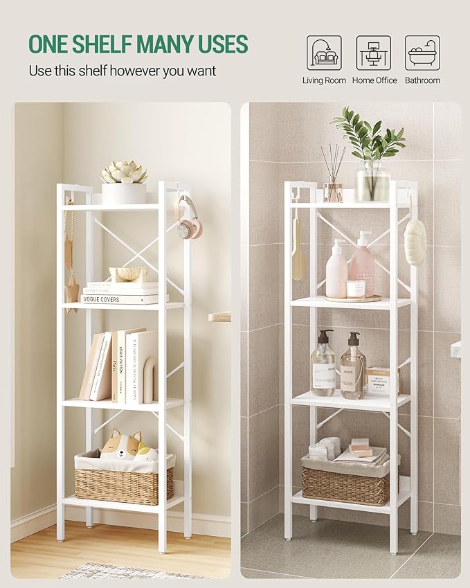 Bookshelf, Book Shelf, Industrial Bookcase with 2 Hooks, Coner Shelf Storage Organizer for Home Office, Living Room, Bedroom, Kitchen, 4-Tier White BC10413W