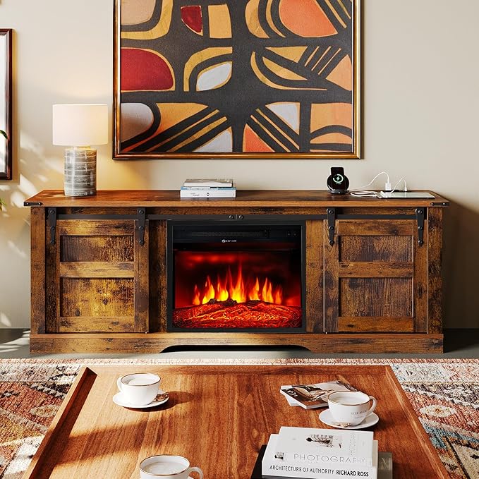 oneinmil Fireplace TV Stand with 18” Electric Fireplace, 58” TV Console Stand for TVs Up to 65", LED Light Entertainment Center, Fireplace for The Living Room TV Stand, Brown