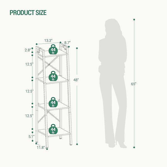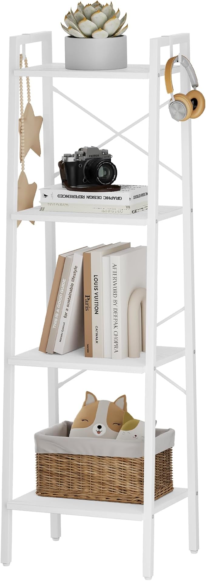 Ladder Shelf, Bookshelf Bookcase, Freestanding Corner Storage Shelve with 2 Hooks for Home Office, Living Room, Kitchen, Bedroom, Industrial, 4-Tier White BC13213W