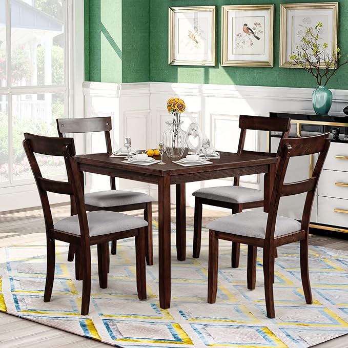 5 Piece Set Industrial Wooden Table and 4 Chairs, with High-Density Foam Burlap Upholstered Cushions for Dining, Living Room, and Kitchen, Easy to Assemble, Brown