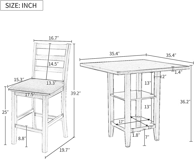 5 Piece Wooden Counter Height Set, Includes 1 Table, 4, Padded Chairs and Storage Shelving, for Dining, Living Room, Kitchen, Espresso
