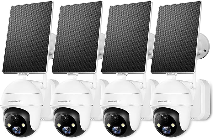 ZUMIMALL Solar Security Cameras Wireless Outdoor - 4 Packs, 360° View Outdoor Camera Wireless Solar Powered,2.4G WiFi Only, Spotlight/Siren//3MP Color Night Vision/AI Detection/IP66, Work with Alexa