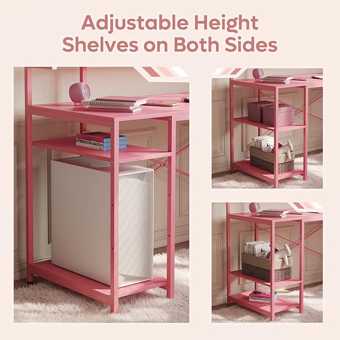Bestier Pink Gaming Desk with Reversible Power Outlets, 55 inch LED Computer Desk with Monitor Stand & Adjustable Shelves, Writing Desk with Cup Holder & Hook for Home Office, Pink 3D Carbon Fiber