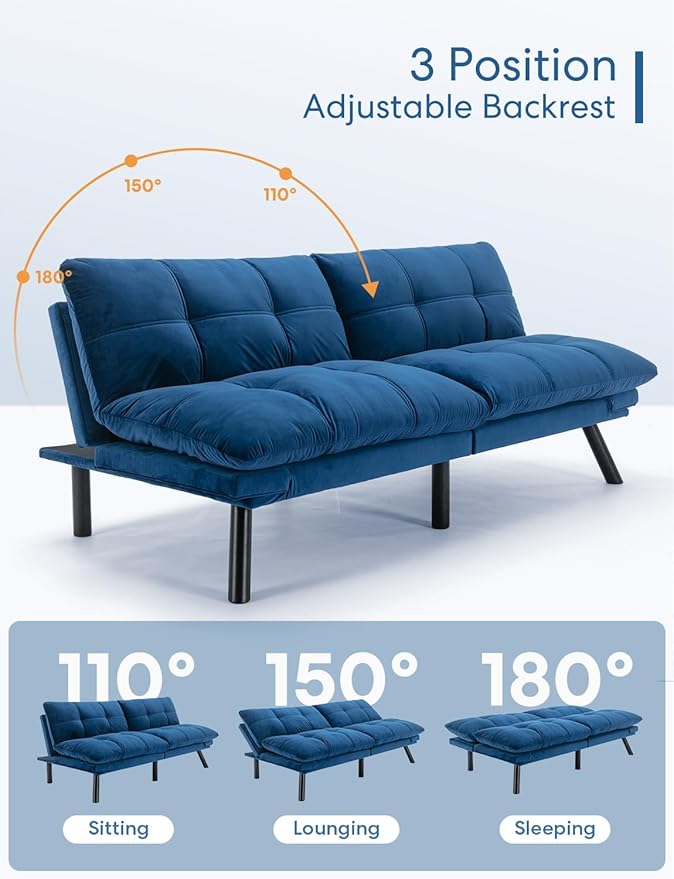 Velvet Convertible Futon Sofa Bed, 71" Comfy Loveseat Sleeper Sofa with Adjustable Backrest Armrest, Strengthen Wood, 7" Thick Padded Cushion, Small 2 Seater Couch for Living Room, Bedroom