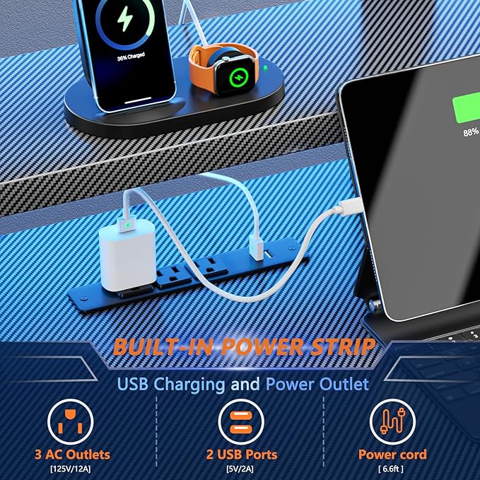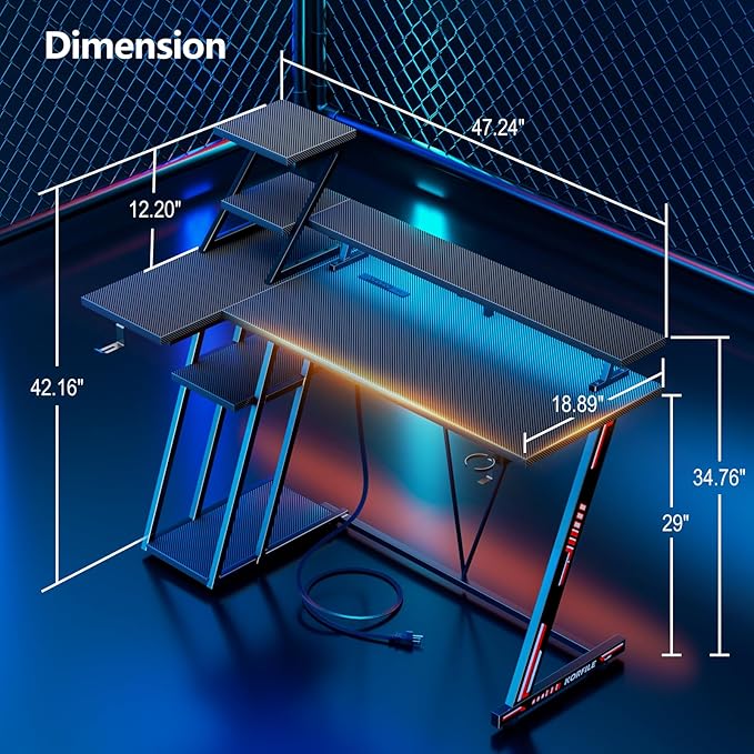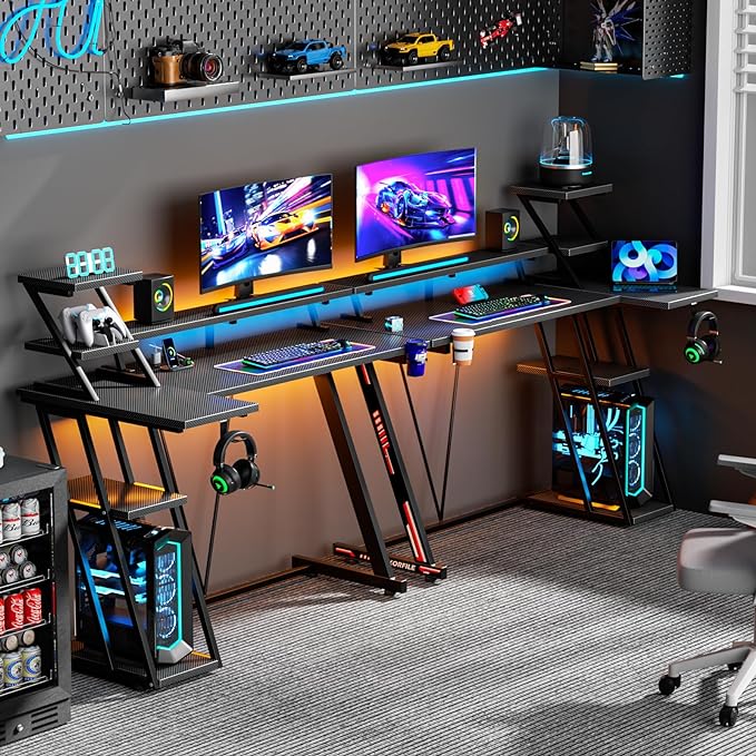 L Shaped Gaming Desk with LED Lights & Power Outlet, 47 Inch Computer Desk with Extra Storage Shelves, Reversible Gamer Workstations with Monitor Stand for Bedroom, Carbon Fiber Black