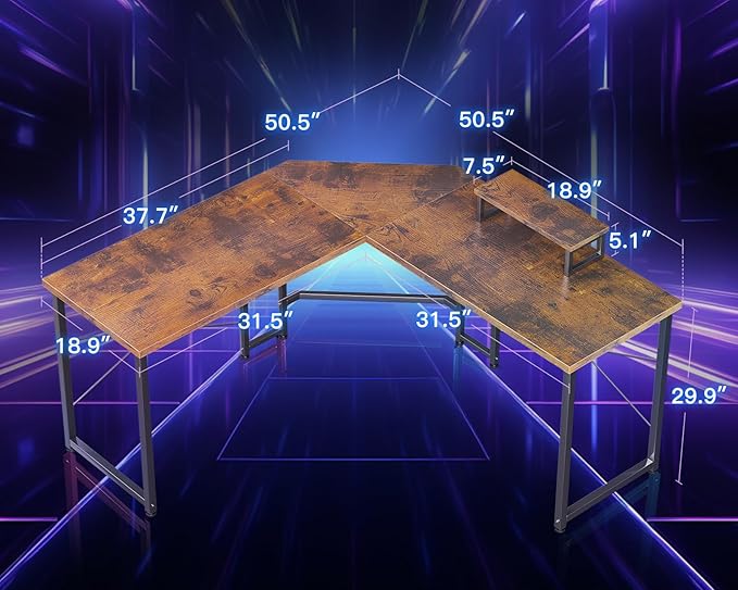 Casaottima L Shaped Gaming Desk with Monitor Stand, Corner Desk Gaming Table for Home Office, Computer Desk Sturdy Writing Workstation for Small Space, 51 inch, Rustic Brown
