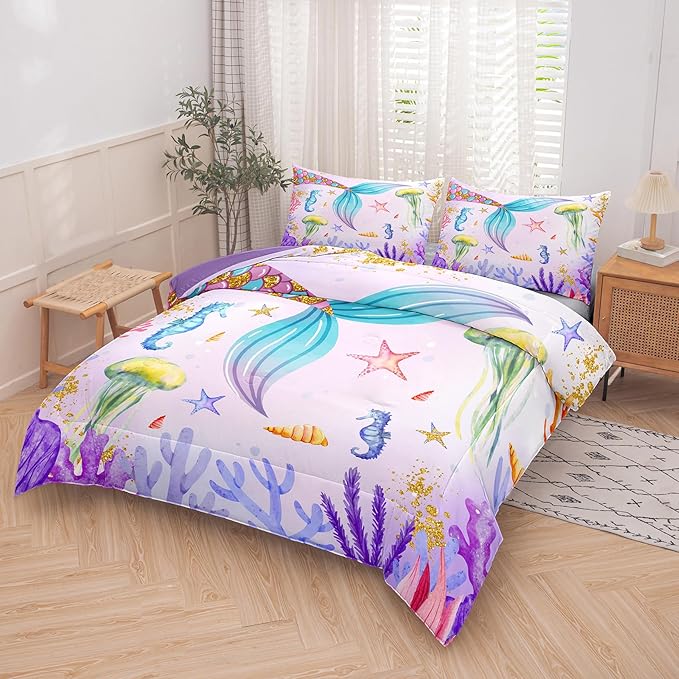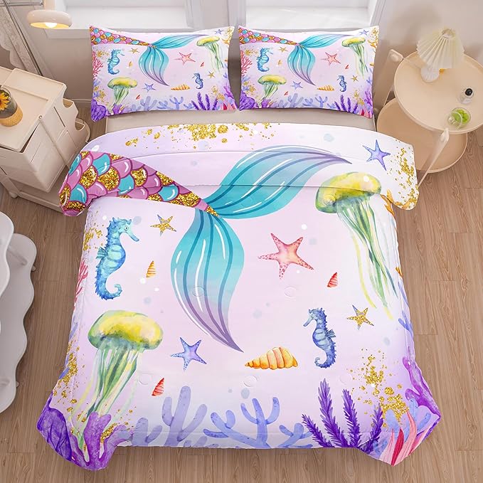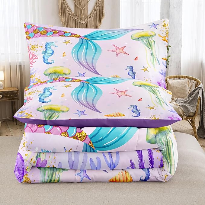 NINENINE Girls Mermaid Bedding Set,Mermaid Tail Comforter Set,Twin Size Bedding Sets for Girls,Princess Toddler Bedding Sets for Girls with 1 Comforter 1 Pillowcase…