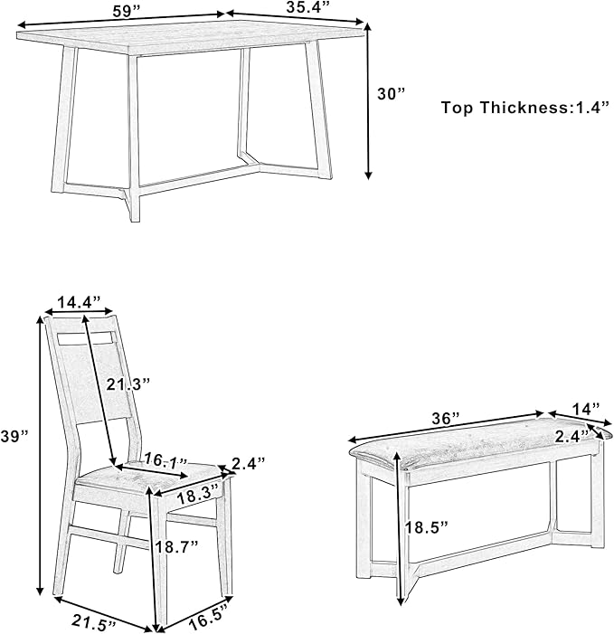 6-Piece Wood Dining Table Set with 4 PU Upholstered Chairs and Bench, Large Tabletop, for Kitchen Living Room, Farmhouse Style, Dark Brown, 59" L x 35.4" W x 30" H
