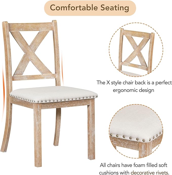 6-Piece Wood 82inch Extendable Dining Table Set with Two 11" Removable Leaves, 4 Upholstered Chairs and Bench, Farmhouse Style, Natural, 60"-82" L x 36" W x 30" H