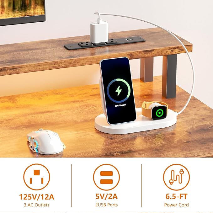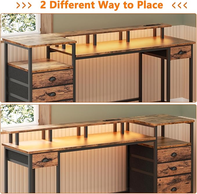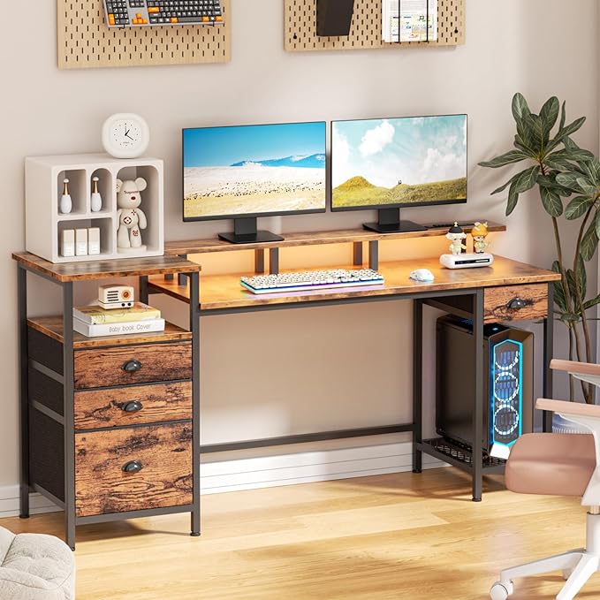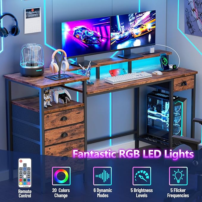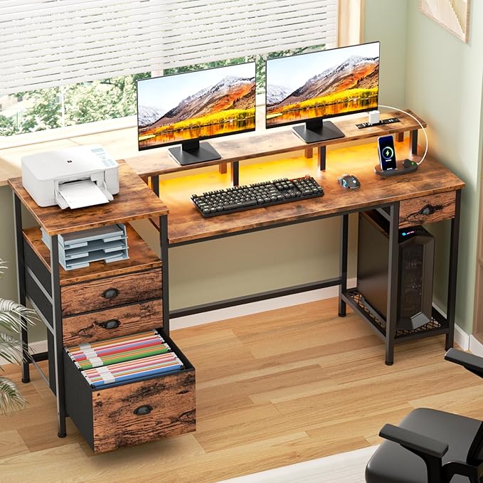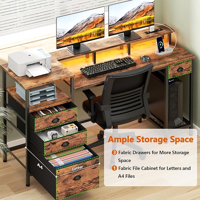 Furologee Computer Desk with Drawers, 60" Office Long Desk with Fabric File Cabinet and Power Outlets, Gaming Desk with LED Lights, Study Writing Work Desk for Home Office, Rustic Brown