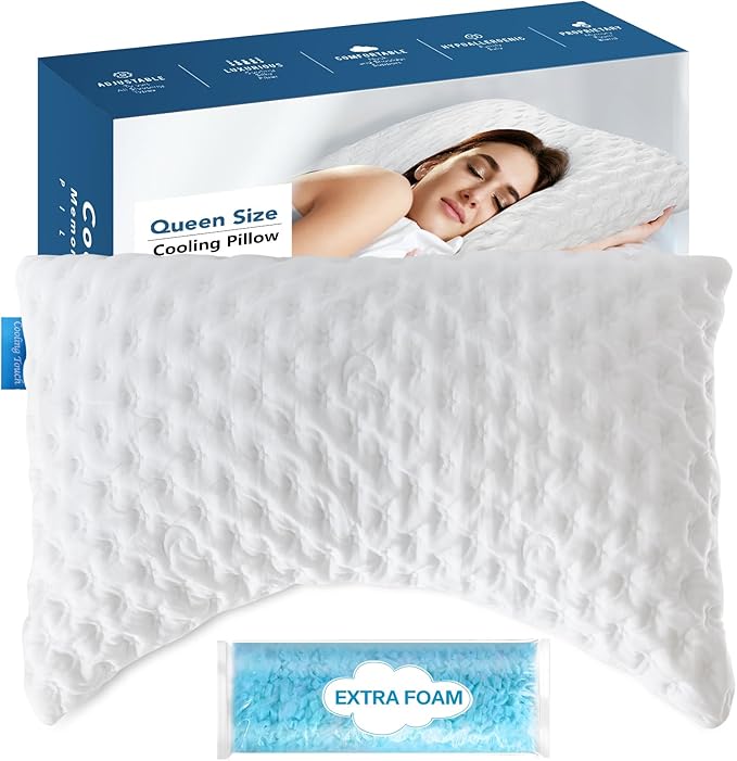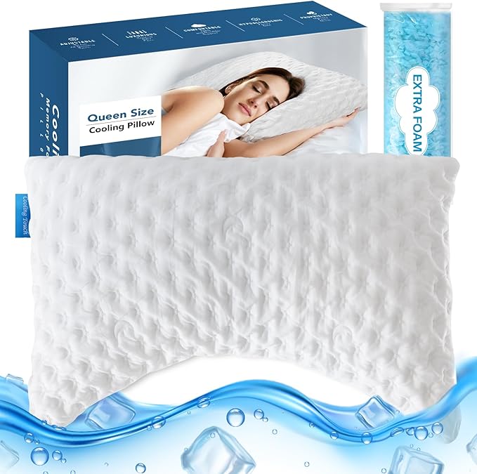 Cooling Side Sleeper Pillow for Neck and Shoulder Pain, Adjustable Shredded Memory Foam Bed Pillows for Sleeping, Ergonomic Curved Pillow with Extra Foam, Queen Size, Hypoallergenic Washable Cover