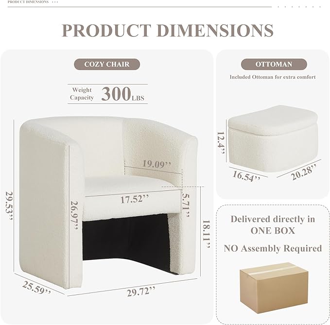 COLAMY Upholstered Sherpa Barrel Accent Chair with Storage Ottoman, Morden Living Room Side Chair, Armchair for Bedroom/Reading Spaces/Office, Craem