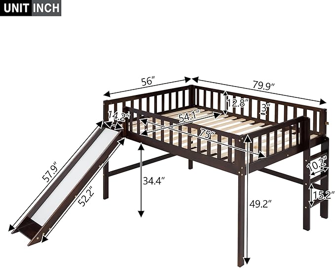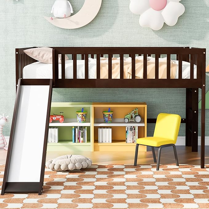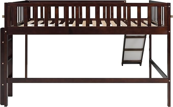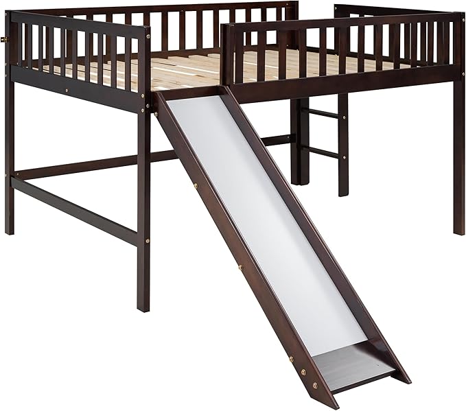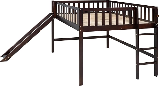 Merax Kids Wood Full Low Loft Bed with Ladder and Slide, Junior Loft Bunk Bed for Boys, Girls,No Box Spring Needed, Espresso