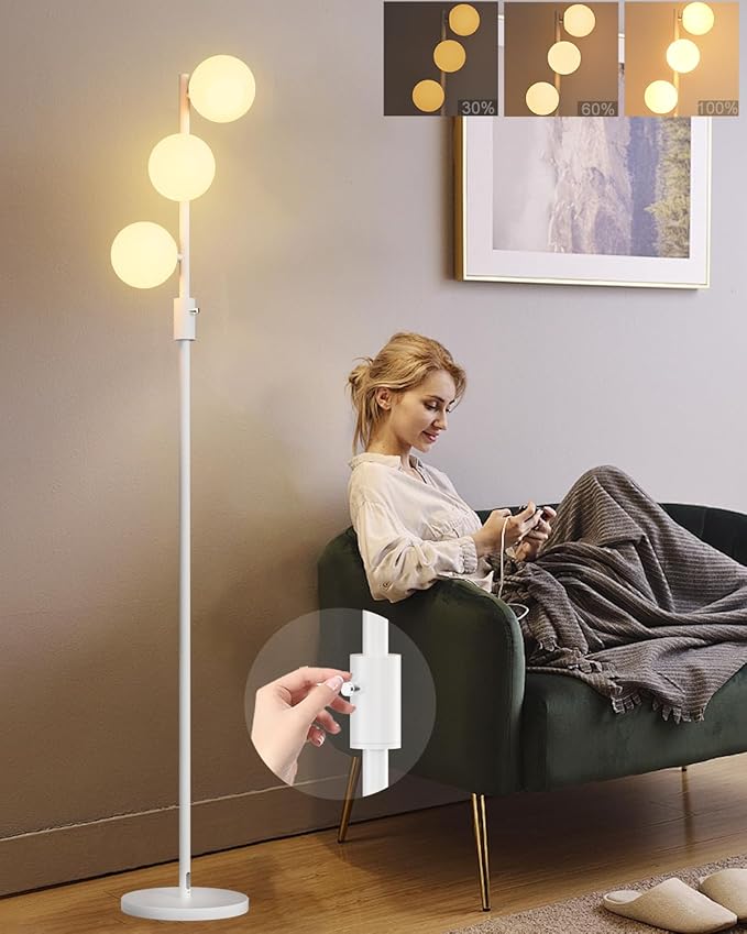 64IN Dimmable White Floor Lamp, Tall Standing Lamps with 3 Globe Soft Warm White Eye Care 3000K G9 Bulbs, Mid Century Modern Floor Lamp for Bedroom Office