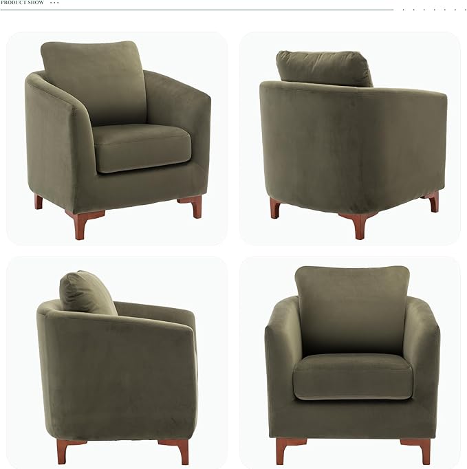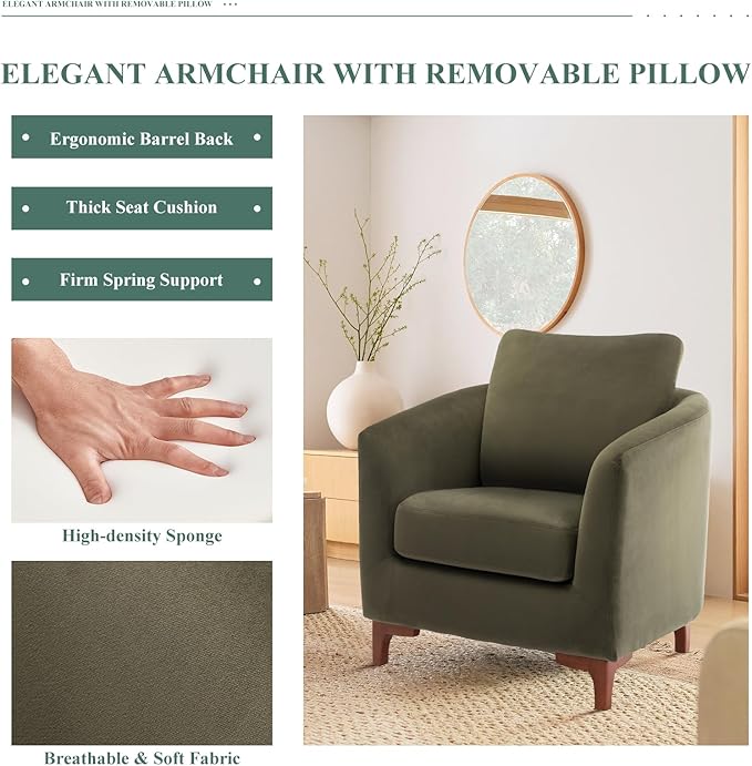 COLAMY Velvet Accent Chair with Storage Ottoman Set, Upholstered Barrel Arm Chair with Footrest, Modern Living Room Chair with Back Pillow, Olive