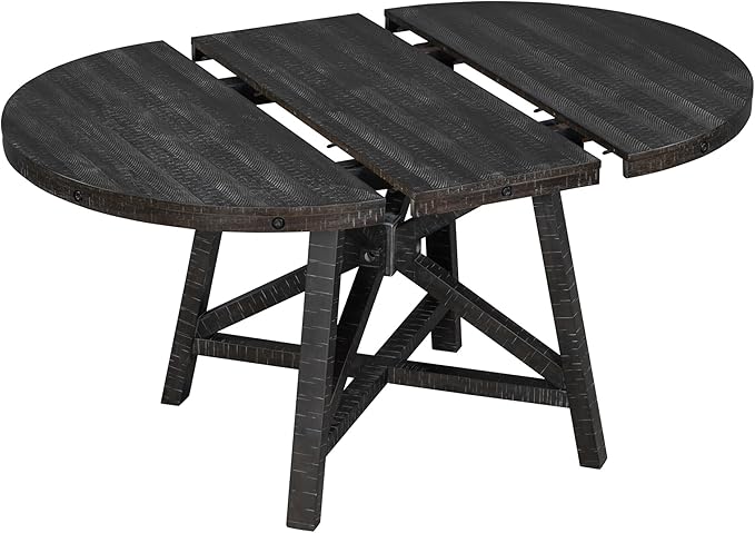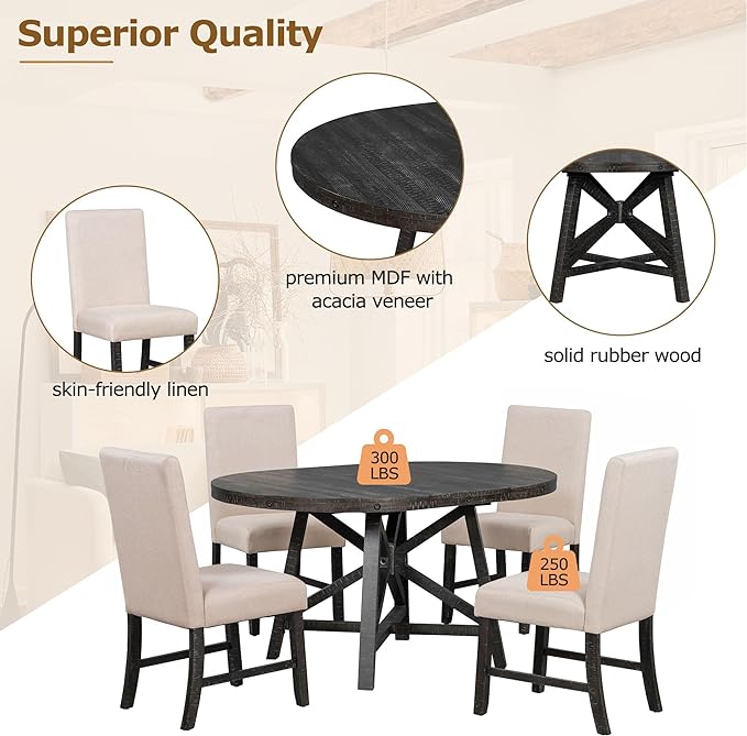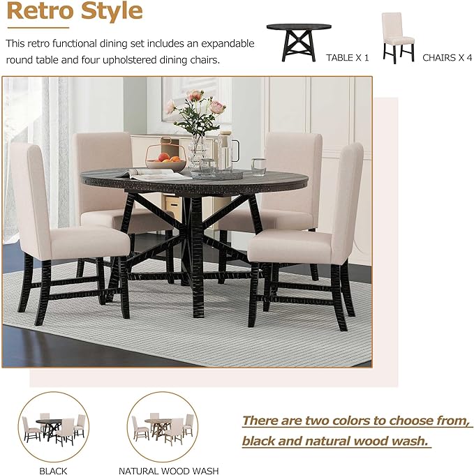 5-Piece Retro Style Dining Set with Extendable Round Table and 4 Upholstered Chairs for Kitchen, Living Room, Black, 42"-58" L x 42" W x 30" H
