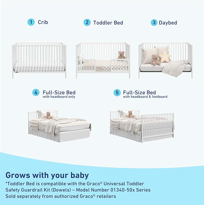 About This 5-IN-1 CONVERTIBLE CRIB: Converts from baby crib (mattress sold separately) to toddler bed (compatible toddler guardrail kit sold...