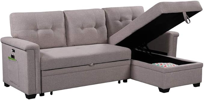 L-Shaped Reversible Sofa, with Side Pocket, USB Charger and Pull-Out Sleeper Bed, 84" Tufted Upholstered Couch, for Compact Space, Living Room, Bedroom, Apartment-Light Gray, 84 Inch