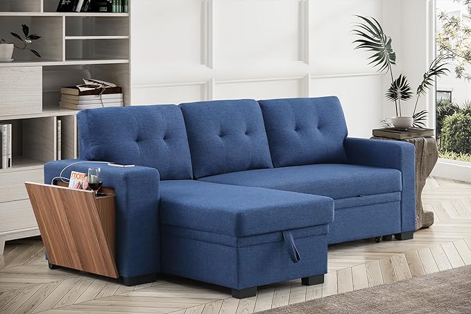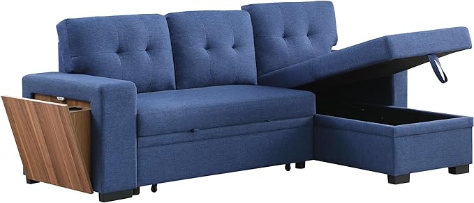 92 inch Convertible Sleeper L-Shaped Sectional Sofa with Storage Chaise, Upholstered Reversible Couch with Side Open Cup Holder for Apartment, Dorm, Living Room, Blue